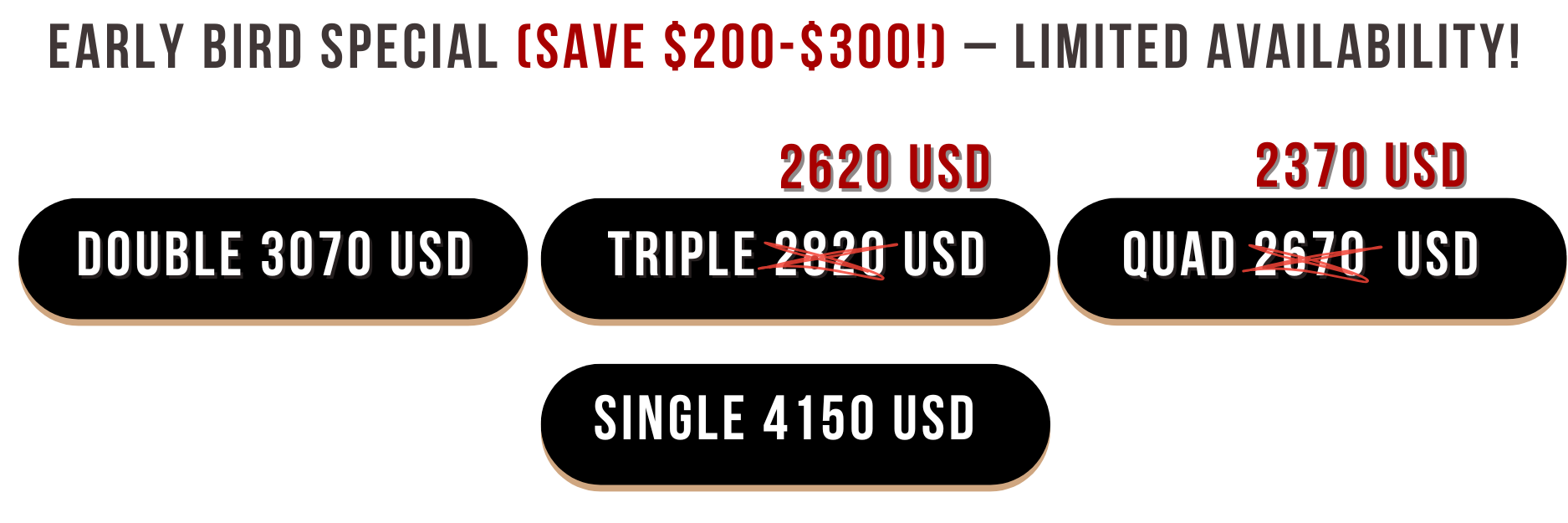Prices are in US Dollars. Secure your spot with a non refundable deposit of $800 USD (subtracted from the total payment). Enjoy flexible payment plans up to 4 installments (processing fee will be added). Full payment deadline is due 30 days prior to the retreat (December 6th). Without the deposit, booking is not confirmed.